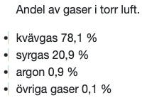 2-1-2 Luftens molekyler trycks ihop av tyngdkraften Om du kollar i en väderapp kommer du förutom temperaturer, luftfuktighet och solens upp- och nedgång stöta på begreppet lufttryck. Ju längre bort ifrån jordens yta vi kommer desto lägre är lufttrycket. Anledningen till dessa skillnader i lufttryck är att molekylerna i luften blir mer hoppressade av jordens dragningskraft ju närmare jordytan de är. Vid havsytan är alltså molekylerna i luften närmare varandra än uppe på Mount Everest. Därför säger vi att luften är tunn på hög höjd. Oavsett om lufttrycket är lågt eller högt är proportionerna av gaserna i luften desamma. Luft innehåller ungefär 78 % kvävgas och 21 % syrgas. Det finns även små mängder av andra gaser i luften. |