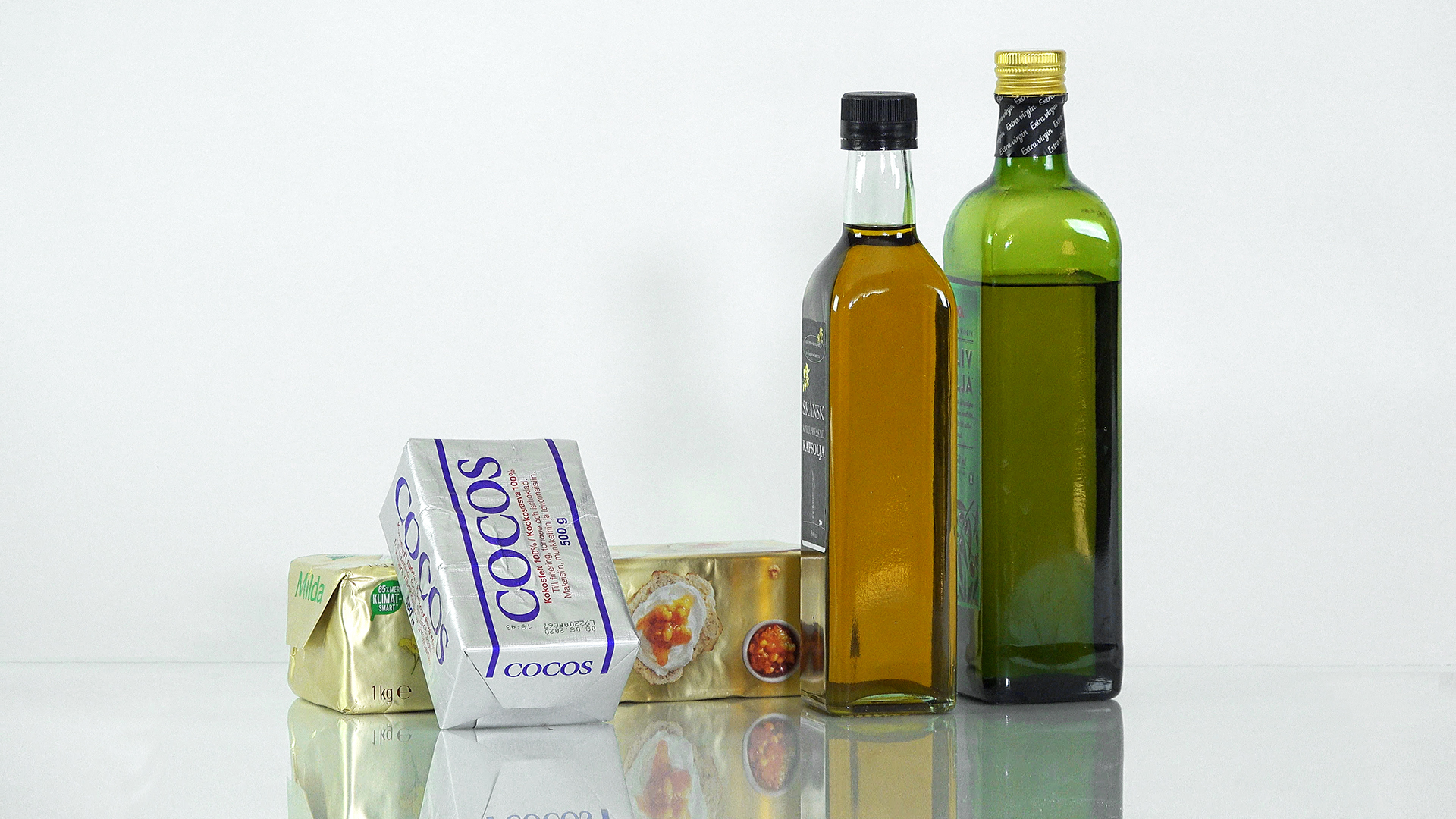 2-2-9 Fettsyrorna kan vara mättade eller omättade Om bindningarna mellan kolatomerna i fettsyrorna bara består av enkelbindningar kallas de för mättade fetter. Dessa fetter är ofta fasta vid rumstemperatur. Det finns också en annan bindningstyp som kallas för dubbelbindningar. Varje kolatom kan bilda fyra bindningar till andra atomer. I en dubbelbindning används två av dessa bindningar för att binda till en och samma kolatom. Ämnen som innehåller dubbelbindningar kallas omättade. De triglycerider som innehåller fettsyror med dubbelbindningar kallas för omättade fetter. Om det bara finns en dubbelbindning i fettet kallas det för enkelomättat. Om det finns fler kallas det för fleromättat. Om vi tittar på innehållsförteckningen på smörpaketet eller olivoljeflaskan kan vi läsa om vilken sammansättning fettet har. De omättade fetterna, till exempel olivolja, är ofta flytande. |