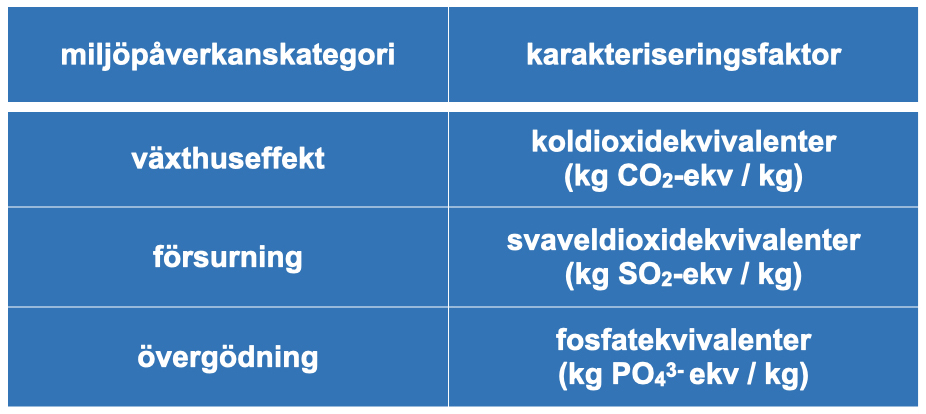 5-10-6 Steg 3 – Miljöpåverkansbedömning Efter inventeringsanalysen finns en stor mängd information insamlad kring alla utsläpp som en produkt ger upphov till och hur mycket resurser den förbrukar. Det kan vara ganska svårt att bedöma vilken information som är viktig ur miljösynpunkt och som bidrar mest till produktens miljöpåverkan. Först sorteras informationen utifrån vilken typ av miljöpåverkan det gäller. Några exempel är försurning, övergödning och växthuseffekt. Denna indelning är baserad på naturvetenskapliga samband. Vi vet till exempel att koldioxid bidrar till den ökande växthuseffekten. Denna sortering kallas för klassificering. Efter klassificeringen görs en karakterisering. Det innebär att alla utsläpp som har en viss miljöpåverkan räknas om med hjälp av en karakteriseringsfaktor. För påverkan på växthuseffekten jämförs alla utsläpp av växthusgaser med koldioxid. Koldioxid har karakteriseringsfaktorn 1. Alla utsläpp som påverkar växthuseffekten räknas då om till koldioxidekvivalentermed hjälp av sin karakteriseringsfaktor. Olika växthusgaser påverkar växthuseffekten olika mycket. Ett exempel är metan som har ungefär 25 gånger starkare påverkan på växthuseffekten jämfört med koldioxid. Det betyder att ett kilogram metan påverkar klimatet 25 gånger mer än ett kilogram koldioxid. Därför multipliceras utsläppen av metan med 25. På samma vis mäts försurning som kilogram svaveldioxidekvivalenter. Svaveldioxid är en gas som leder till försurning. Övergödning mäts som kilogram fosfatekvivalenter. Fosfatjoner leder till övergödning. ![]() På detta vis fås miljöpåverkan för den produkt eller process som studeras. Resultatet visas ofta som påverkan på olika miljöeffekter per funktionell enhet, till exempel i kilogram koldioxidekvivalenter per funktionell enhet. |