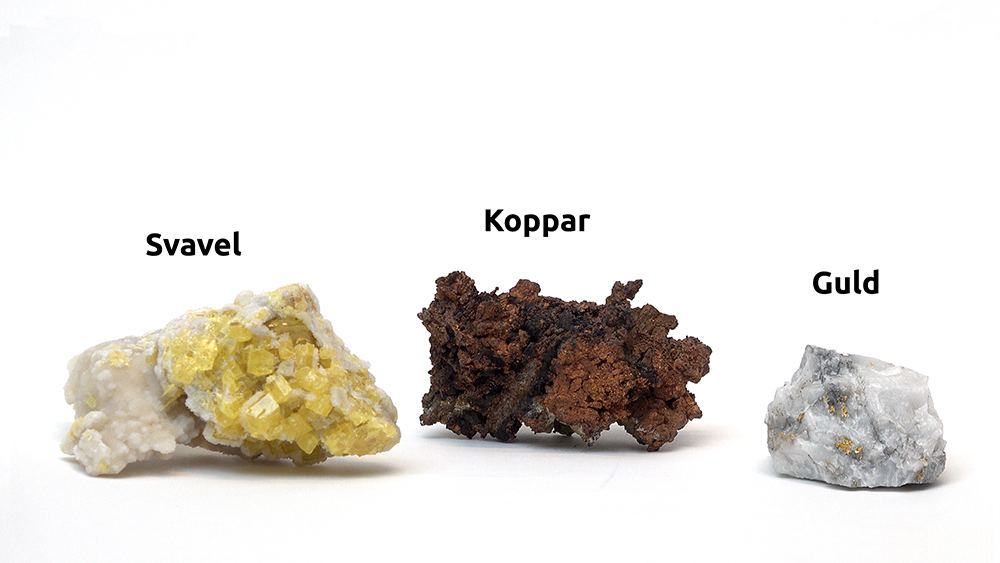 4-1-5 Ett fåtal grundämnen finns i ren form i naturen Ett fåtal grundämnen kan vi hitta i ren form i naturen. Förutom ädelgaserna är det till exempel de vanliga gaserna syrgas (O2) och kvävgas (N2) i luften. Vi hittar svavel (S8) i områden med vulkaner, och så grupp 11, myntmetallerna koppar (Cu), silver (Ag) och guld (Au). Dessutom kan vi hitta rent kol (C) i form av diamant.