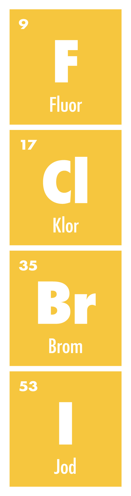4-1-3 Halogener tar gärna upp en extra elektron På ett liknande sätt har det periodiska systemet 18 kolumner. Ett exempel är kolumn 17 där vi hittar en grupp grundämnen som gärna tar upp en extra elektron och bildar laddade joner med laddningen minus ett. Här hittar vi till exempel fluor (F) med fluoridjonerna (F-) som finns i tandkräm, och klor (Cl) med kloridjonerna (Cl-) som vi hittar i vanligt salt. Här hittar vi även jod (I). Jods negativa jodidjoner (I-) är viktiga för att vår kropp ska kunna tillverka vissa hormoner i sköldkörteln. Brist på jodidjoner ger upphov till en rad allvarliga problem för både vuxna och barn. Cirka 800 miljoner människor lider av jodbrist i högre eller mindre grad. Därför kan vi i Sverige och i många andra länder köpa koksalt med tillsatts av jodidjoner. För att jodera koksalt (NaCl) tillsätts kaliumjodid (KI). Både natriumjoner och kaliumjoner har en plusladdning. De står också i samma kolumn i periodiska systemet eftersom de bildar joner med samma laddning. Kaliumjoner (K+) är också nödvändiga för vår kropp. |
