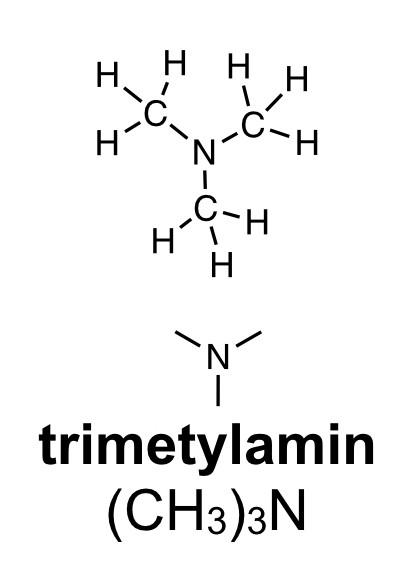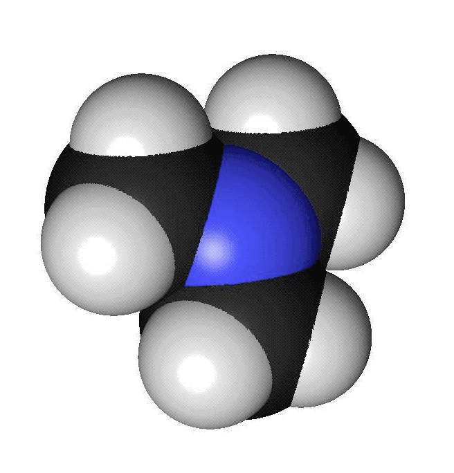1-2-10 Aminer luktar ofta fisk ![]() Aminer innehåller atomslaget kväve. Många aminer har en obehaglig lukt av fisk. När en död fisk ligger framme bildas ämnet trimetylamin. Trimetylamin består av en kväveatom som binder till tre kolatomer. |