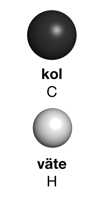 1-2-3 Det finns flera sätt att visa molekyler För att förstå hur molekyler fungerar måste vi kunna visa hur de ser ut. Ett sätt är att använda olika typer av modeller, exempelvis plastmodeller där atomslagen visas som kulor i olika färger. I modellen är kolatomer svarta eller mörkgrå, och väteatomer är vita. Ofta använder vi så kallade kalottmodeller. I en kalottmodell visas hur stor en atom är i proportion till andra atomer. Olika atomer är olika stora. I skolan används ofta fysiska molekylmodeller medan kemister för det mesta gör digitala tredimensionella bilder av molekylerna i en dator. Ibland passar det bättre att rita upp molekylens kemiska struktur. I sådana bilder har varje atomslag en egen beteckning. Kol har beteckningen C. Väte har beteckningen H. Beteckningarna är internationella så med hjälp av detta kemiska språk går det att prata kemi med människor över hela jorden. |